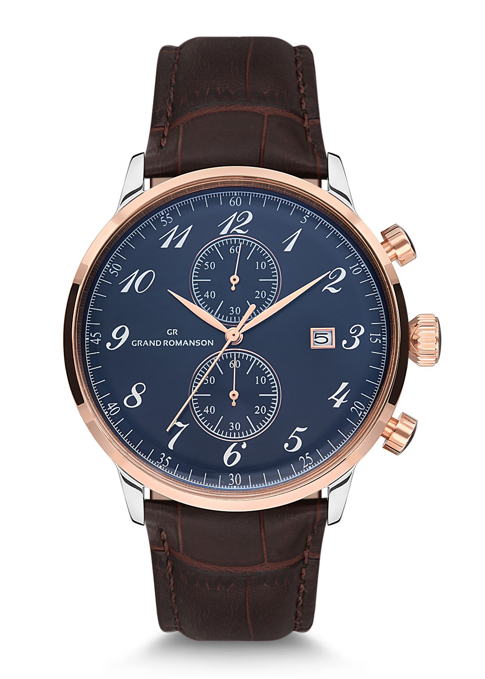 Erkek - Kronometre - Rose Beyaz - Mavi̇ - Doğal Deri̇ Kordon - Mavi̇ - 3 Atm - Grand Romanson