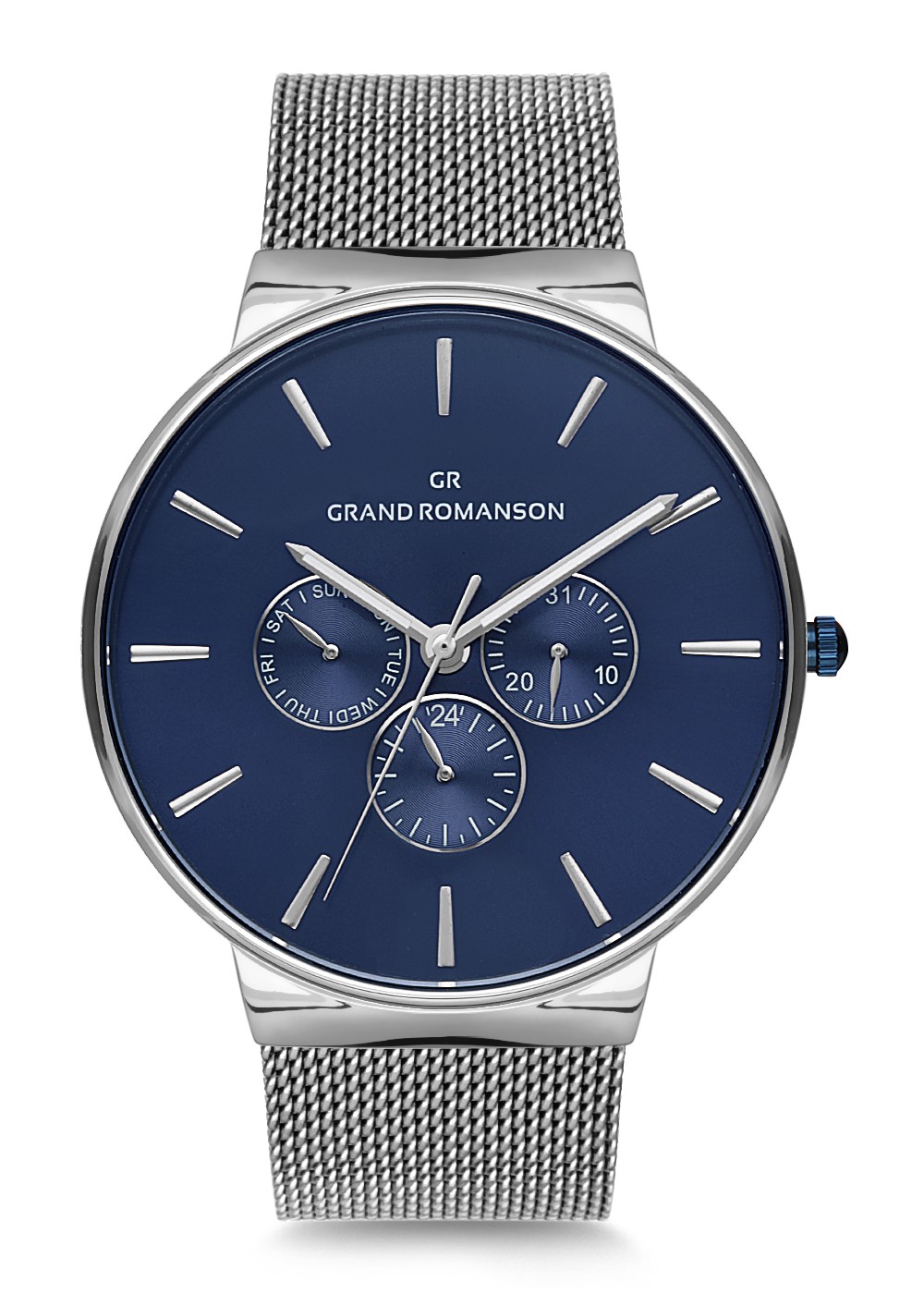 Erkek - Multi̇ Fonksi̇yon - Gümüş - Mavi̇ - Çeli̇k Örme Kordon - 3 Atm - Sertleşti̇ri̇lmi̇ş Mi̇neral Cam - Grand Romanson - 42
