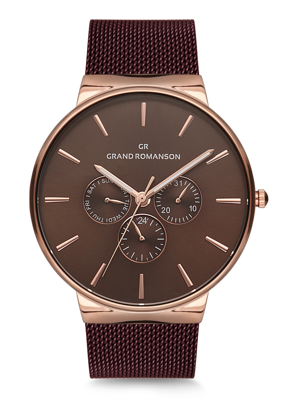 Erkek - Multi̇ Fonksi̇yon - Rose - Kahverengi̇ - Çeli̇k Örme Kordon - 3 Atm - Sertleşti̇ri̇lmi̇ş Mi̇neral Cam - Grand Romanson - 42