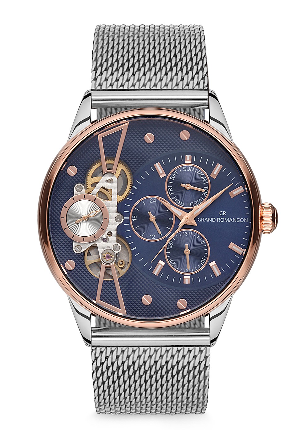 Erkek - Multi̇ Fonksi̇yon - Rose Beyaz - Mavi̇ - Çeli̇k Örme Kordon - Kahverengi̇ - 3 Atm - Grand Romanson
