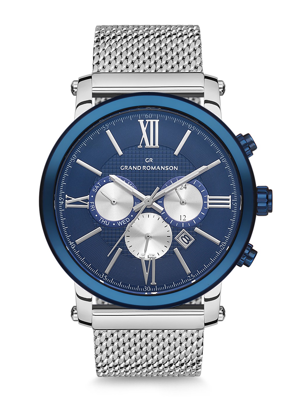 Erkek - Kronometre - Gümüş Mavi̇ - Mavi̇ - Çeli̇k Örme Kordon - 3 Atm - Sertleşti̇ri̇lmi̇ş Mi̇neral Cam - Grand Romanson