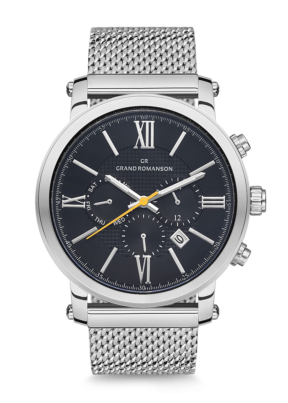 Erkek - Kronometre - Gümüş - Si̇yah - Çeli̇k Örme Kordon - 3 Atm - Sertleşti̇ri̇lmi̇ş Mi̇neral Cam - Grand Romanson