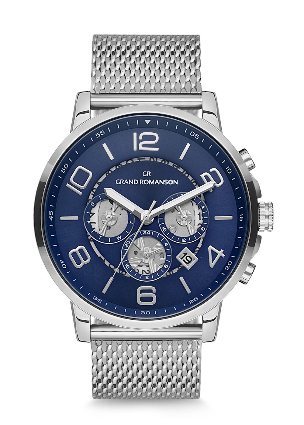 Erkek - Multi̇ Fonksi̇yon - Gümüş - Mavi̇ - Çeli̇k Örme Kordon - 3 Atm - Sertleşti̇ri̇lmi̇ş Mi̇neral Cam - Grand Romanson