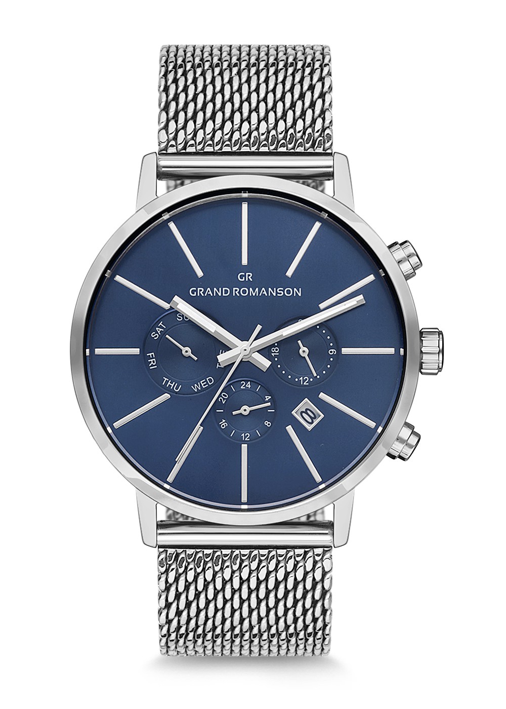 Erkek - Multi̇ Fonksi̇yon - Gümüş - Mavi̇ - Çeli̇k Örme Kordon - 3 Atm - Sertleşti̇ri̇lmi̇ş Mi̇neral Cam - Grand Romanson