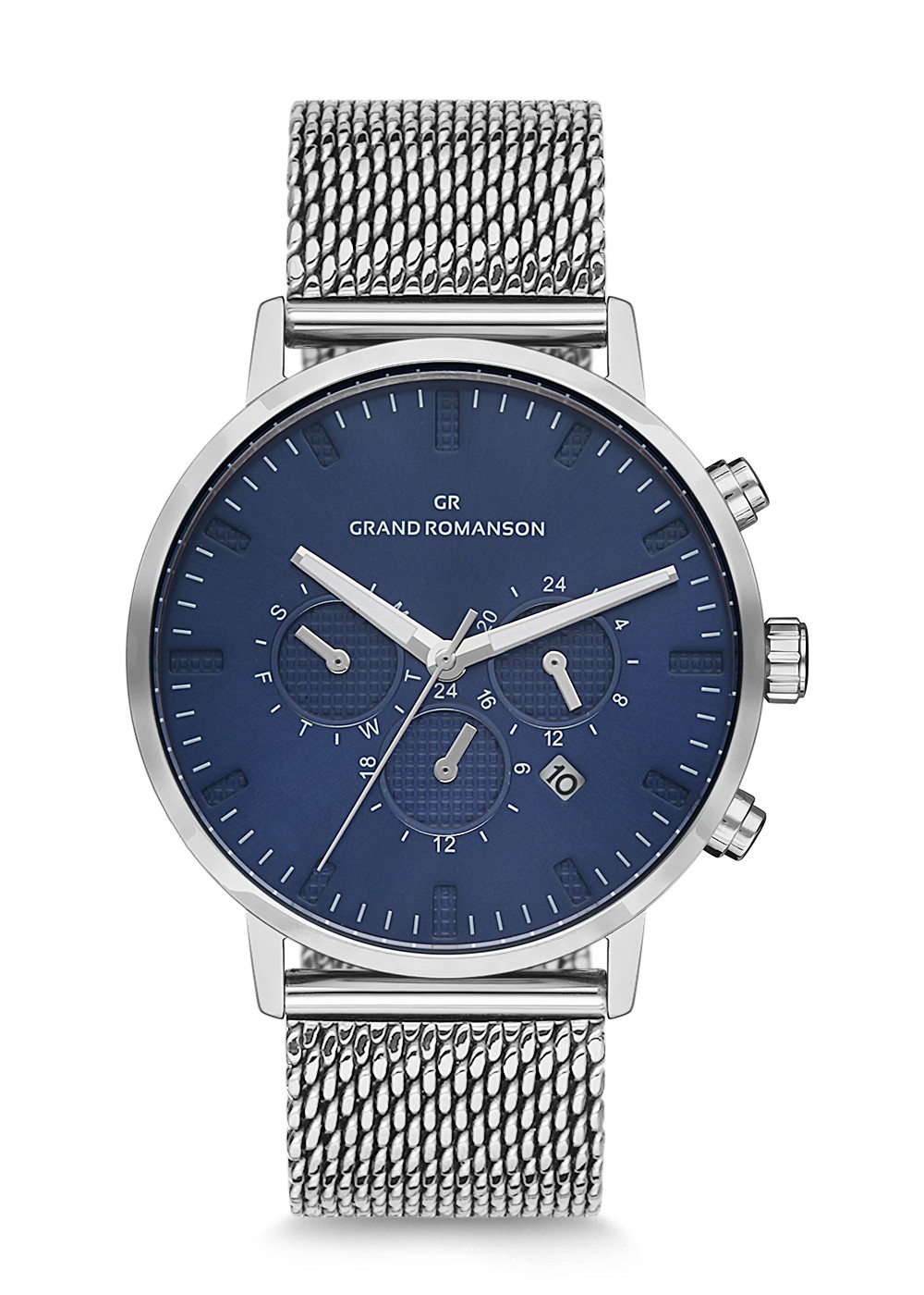Erkek - Multi̇ Fonksi̇yon - Gümüş - Mavi̇ - Çeli̇k Örme Kordon - 3 Atm - Grand Romanson