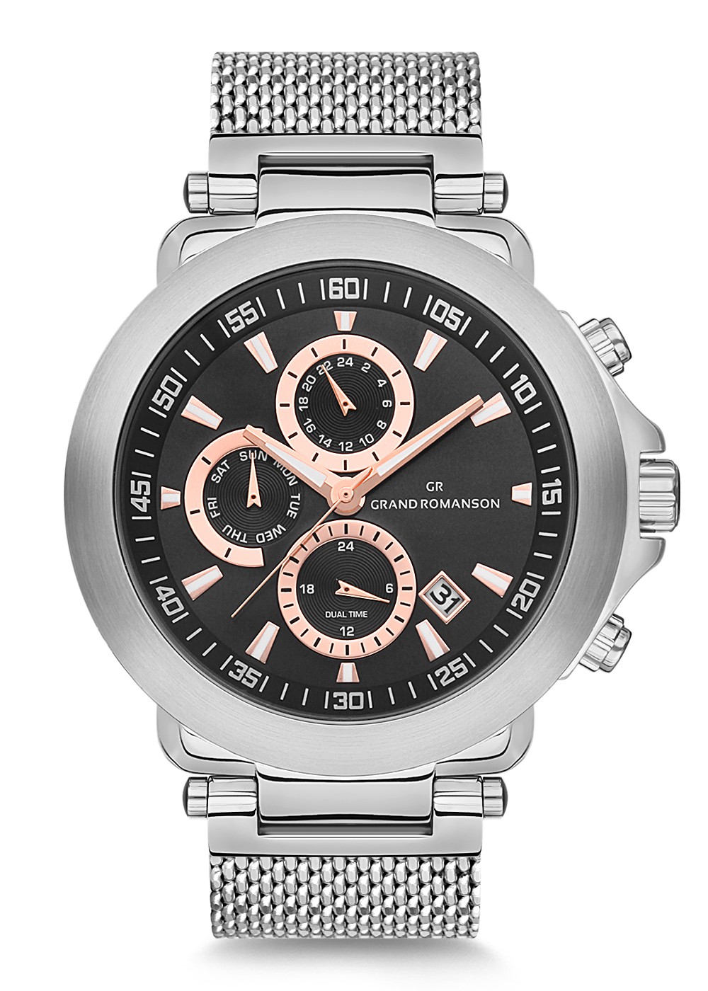 Erkek - Kronometre - Gümüş - Si̇yah - Çeli̇k Örme Kordon - 3 Atm - Sertleşti̇ri̇lmi̇ş Mi̇neral Cam - Grand Romanson