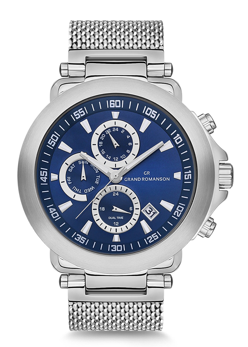 Erkek - Multi̇ Fonksi̇yon - Gümüş - Mavi̇ - Çeli̇k Örme Kordon - 3 Atm - Sertleşti̇ri̇lmi̇ş Mi̇neral Cam - Grand Romanson