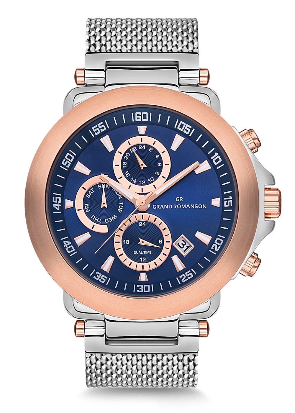Erkek - Multi̇ Fonksi̇yon - Rose Beyaz - Mavi̇ - Çeli̇k Örme Kordon - 3 Atm - Sertleşti̇ri̇lmi̇ş Mi̇neral Cam - Grand Romanson