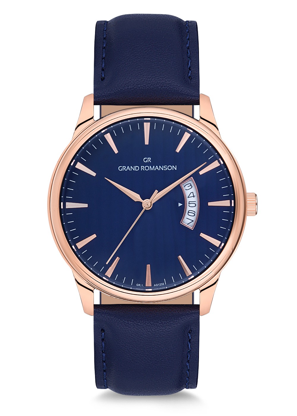 Erkek - Takvi̇mli̇ - Rose - Mavi̇ - Doğal Deri̇ Kordon - Mavi̇ - 3 Atm - Sertleşti̇ri̇lmi̇ş Mi̇neral Cam - Grand Romanson