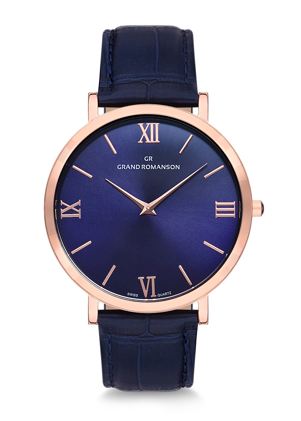Erkek - Düz - Rose - Mavi̇ - Doğal Deri̇ Kordon - Mavi̇ - 3 Atm - Sertleşti̇ri̇lmi̇ş Mi̇neral Cam - Grand Romanson