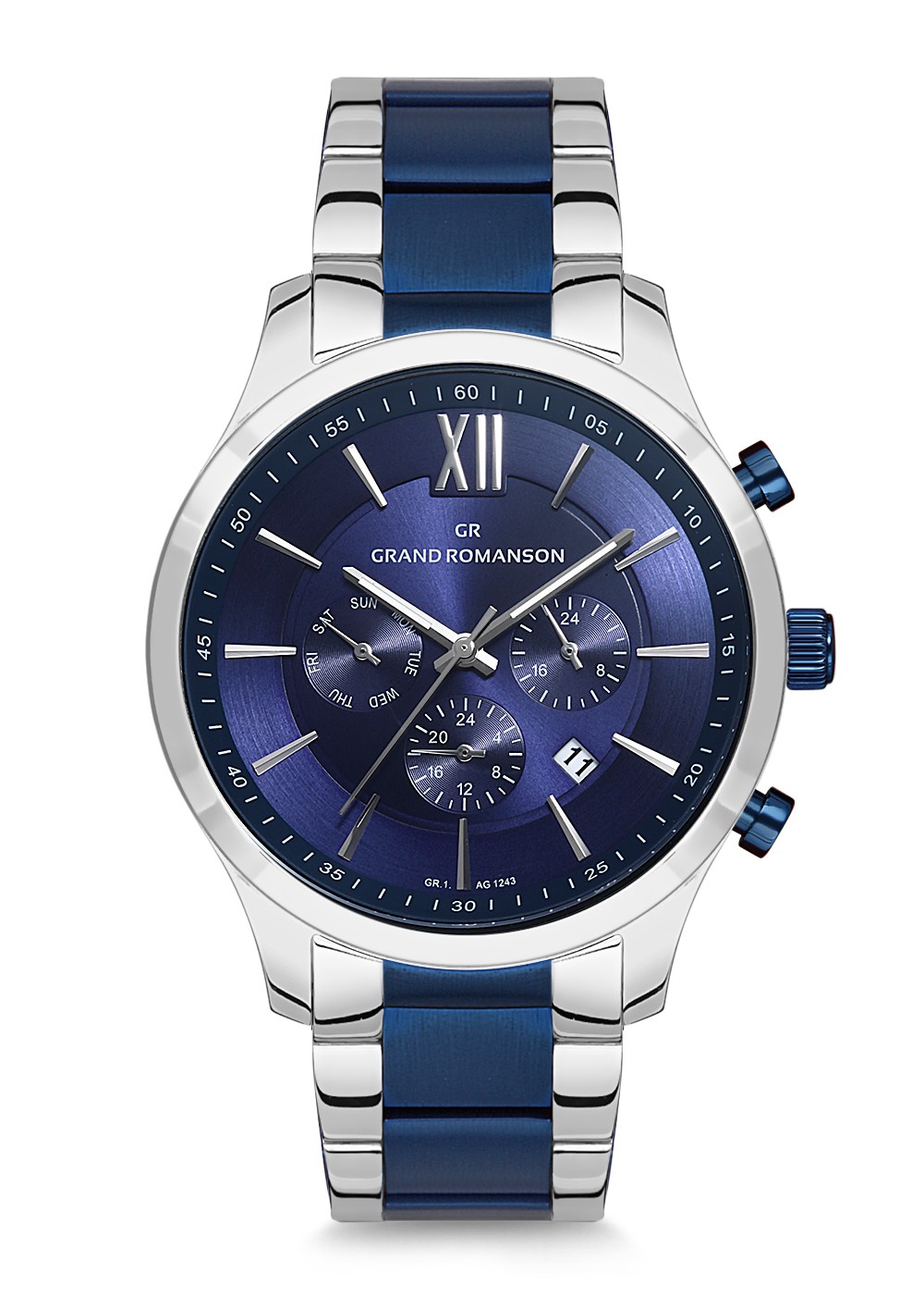 Erkek - Kronometre - Gümüş Mavi̇ - Mavi̇ - Paslanmaz Masi̇f Çeli̇k - 3 Atm - Sertleşti̇ri̇lmi̇ş Mi̇neral Cam - Grand Romanson