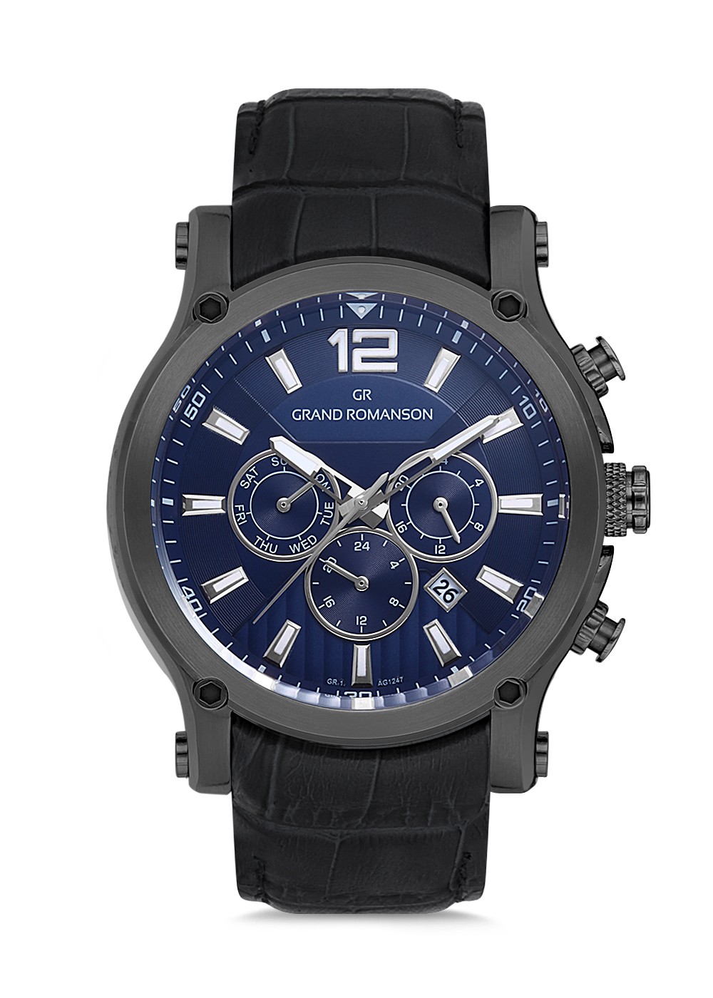 Erkek - Multi̇ Fonksi̇yon - Gun - Mavi̇ - Doğal Deri̇ Kordon - Si̇yah - 3 Atm - Sertleşti̇ri̇lmi̇ş Mi̇neral Cam - Grand Romanson