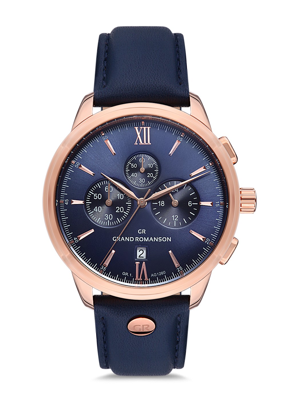 Erkek - Kronometre - Rose - Mavi̇ - Doğal Deri̇ Kordon - Mavi̇ - 3 Atm - Sertleşti̇ri̇lmi̇ş Mi̇neral Cam - Grand Romanson