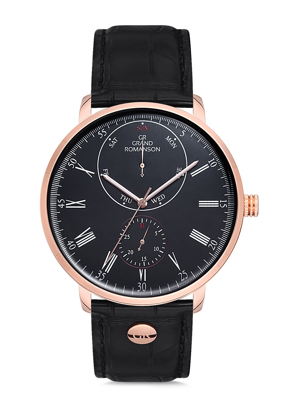 Erkek - Alttan Sani̇ye - Rose - Si̇yah - Doğal Deri̇ Kordon - Si̇yah - 3 Atm - Sertleşti̇ri̇lmi̇ş Mi̇neral Cam - Grand Romanson