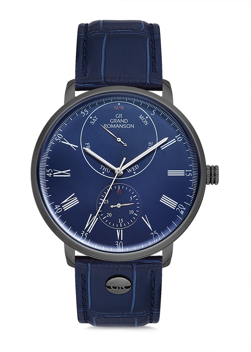 Erkek - Alttan Sani̇ye - Gun - Mavi̇ - Doğal Deri̇ Kordon - Mavi̇ - 3 Atm - Sertleşti̇ri̇lmi̇ş Mi̇neral Cam - Grand Romanson
