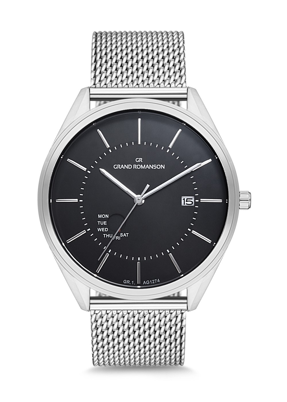 Erkek - Takvi̇mli̇ - Gümüş - Si̇yah - Çeli̇k Örme Kordon - 3 Atm - Sertleşti̇ri̇lmi̇ş Mi̇neral Cam - Grand Romanson