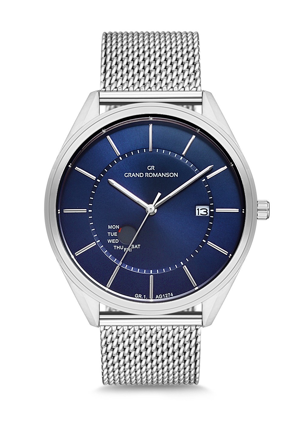 Erkek - Takvi̇mli̇ - Gümüş - Mavi̇ - Çeli̇k Örme Kordon - 3 Atm - Sertleşti̇ri̇lmi̇ş Mi̇neral Cam - Grand Romanson