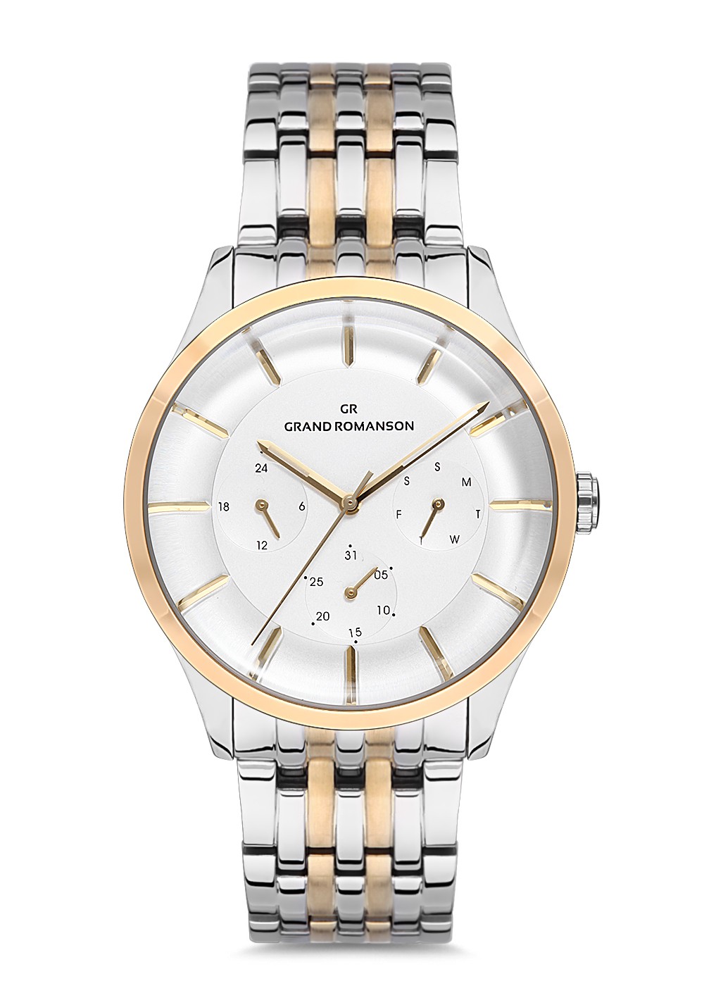 Erkek - Multi̇ Fonksi̇yon - Sari Beyaz - Gümüş - Paslanmaz Masi̇f Çeli̇k - 3 Atm - Sertleşti̇ri̇lmi̇ş Mi̇neral Cam - Grand Romanson - 42