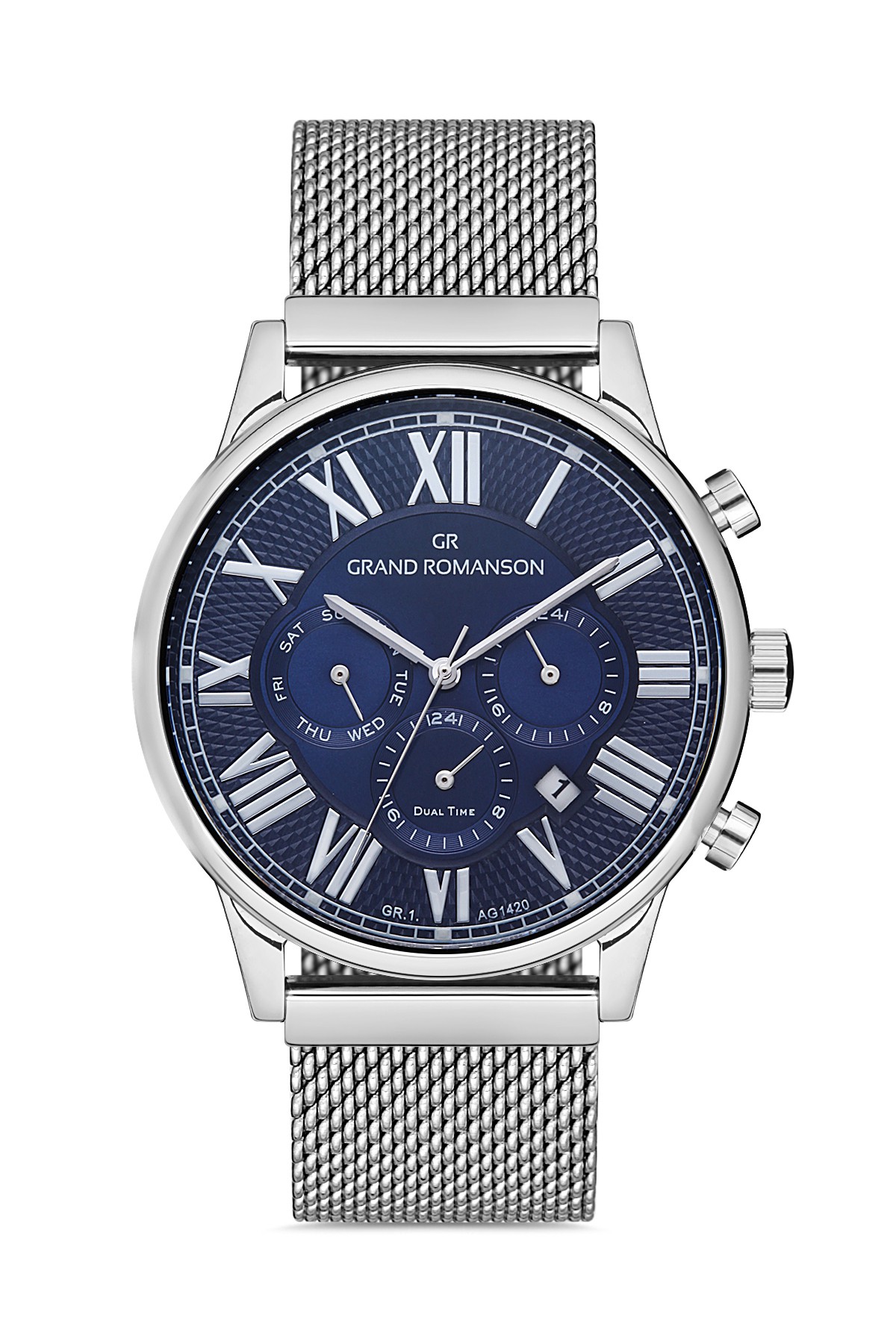Erkek - Multi̇ Fonksi̇yon - Gümüş - Mavi̇ - Çeli̇k Örme Kordon - 3 Atm - Sertleşti̇ri̇lmi̇ş Mi̇neral Cam - Grand Romanson