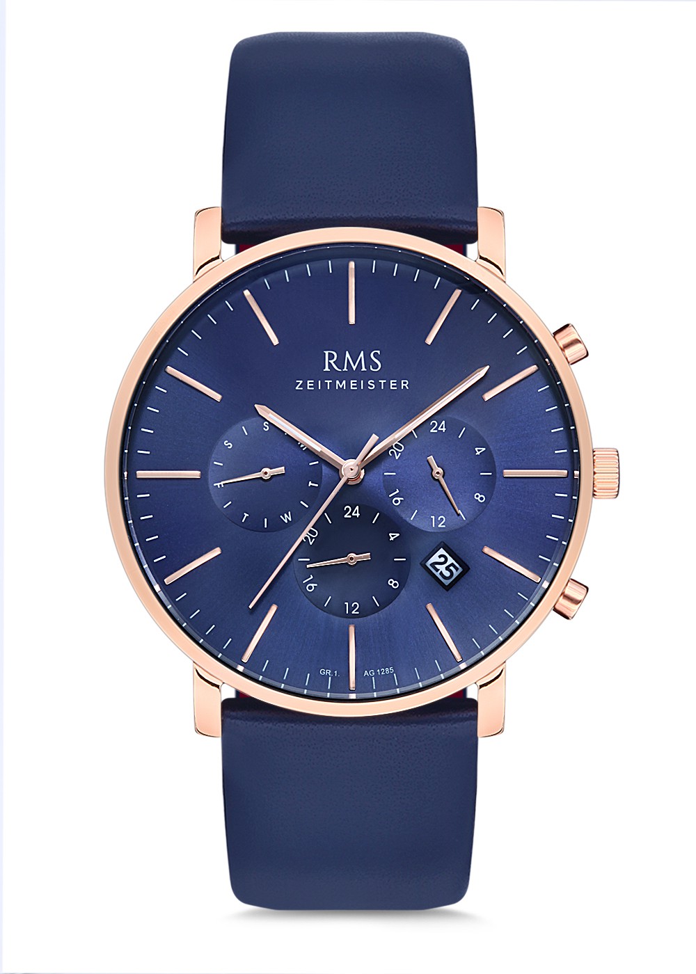 Erkek - Multi̇ Fonksi̇yon - Rose - Mavi̇ - Doğal Deri̇ Kordon - Mavi̇ - 3 Atm - Sertleşti̇ri̇lmi̇ş Mi̇neral Cam - Grand Romanson