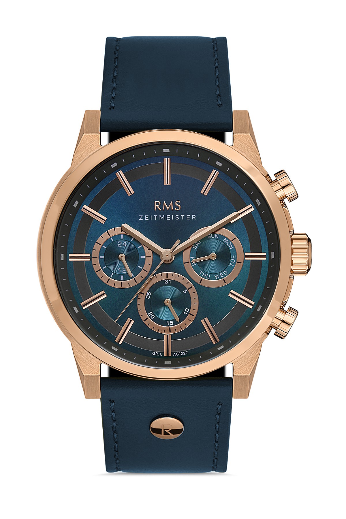 Erkek - Multi̇ Fonksi̇yon - Rose - Mavi̇ - Doğal Deri̇ Kordon - Mavi̇ - 3 Atm - Sertleşti̇ri̇lmi̇ş Mi̇neral Cam - Grand Romanson