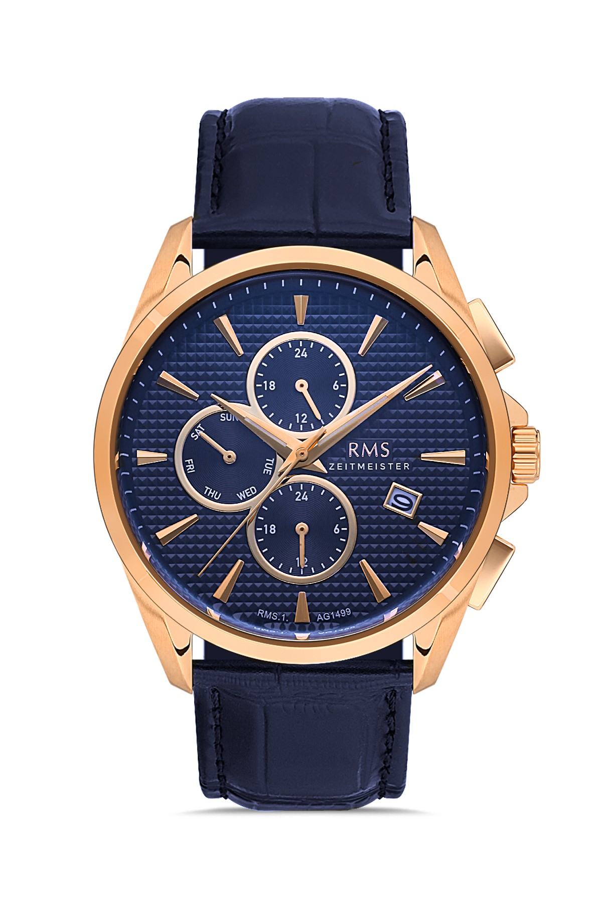 Erkek - Multi̇ Fonksi̇yon - Rose - Mavi̇ - Doğal Deri̇ Kordon - Mavi̇ - 3 Atm - Sertleşti̇ri̇lmi̇ş Mi̇neral Cam - Grand Romanson - 44