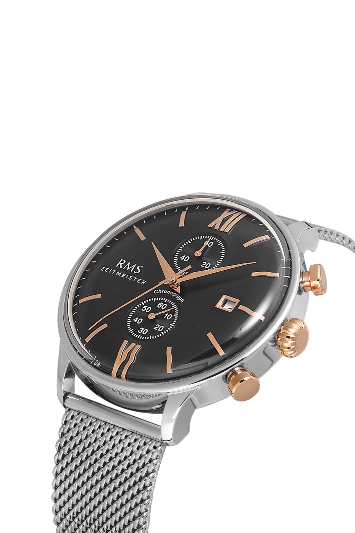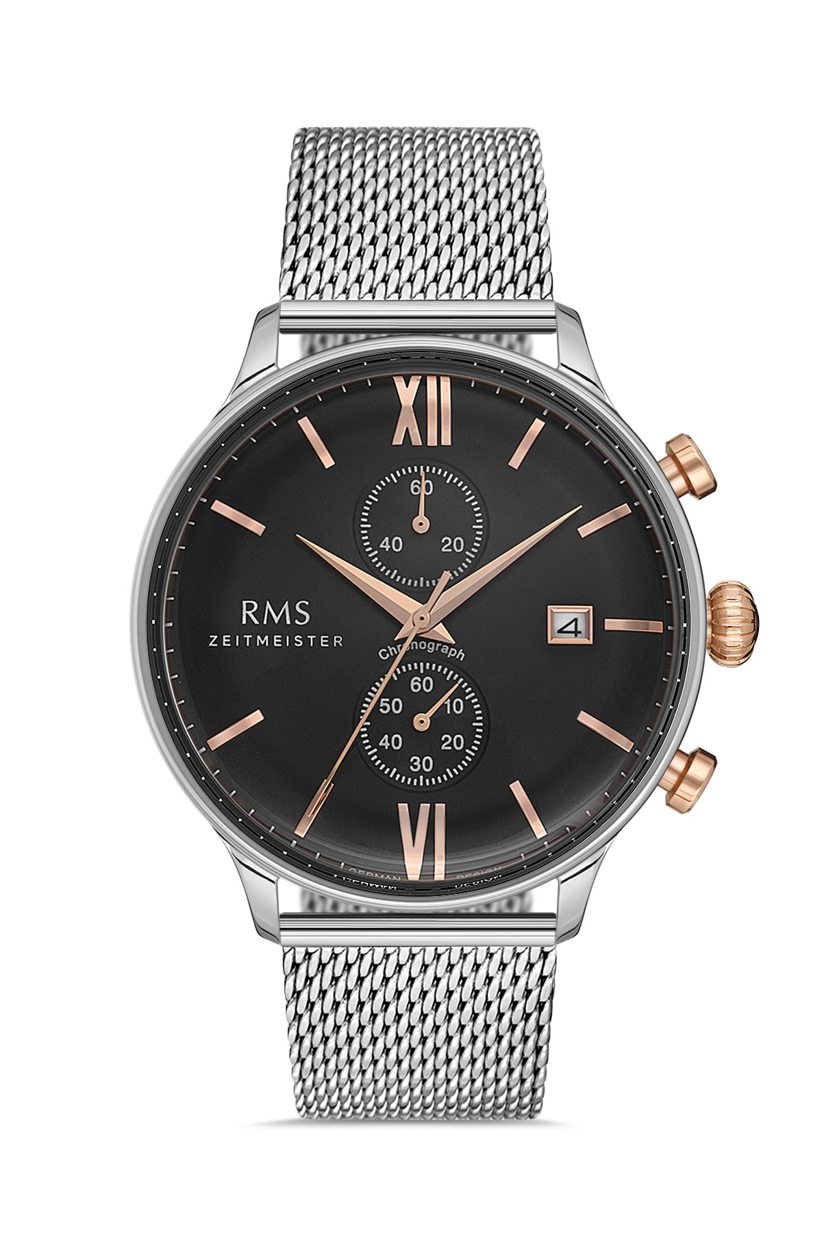 Erkek - Kronometre - Gümüş - Si̇yah - Çeli̇k Örme Kordon - 5 Atm - Sertleşti̇ri̇lmi̇ş Mi̇neral Cam - Grand Romanson - 46
